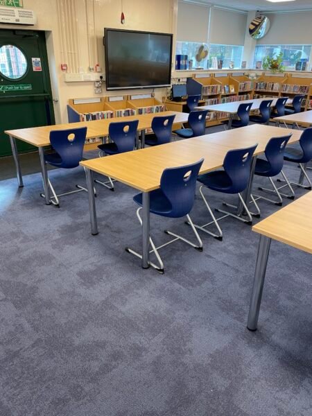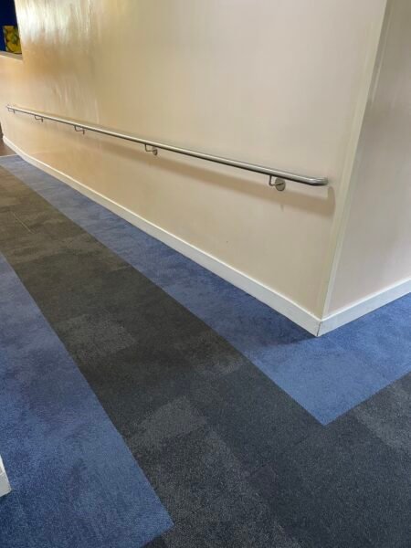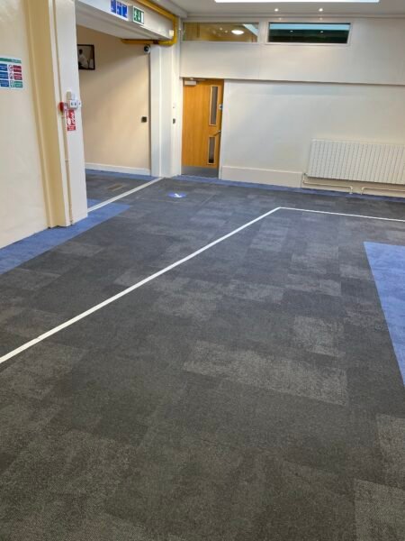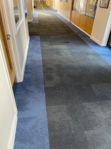 This project saw Selby team up with our long term client Ashcroft Academy to replace further areas including the reception, classrooms and corridors. Interface carpet tiles and EMS matting were used to provide a modern finish whilst also being able to abstain the large footfall. The stunning blue border runs throughout the academy creating a seamless, professional look that the pupils are proud of. The work was able to be carried out during various holidays to avoid any hassle!