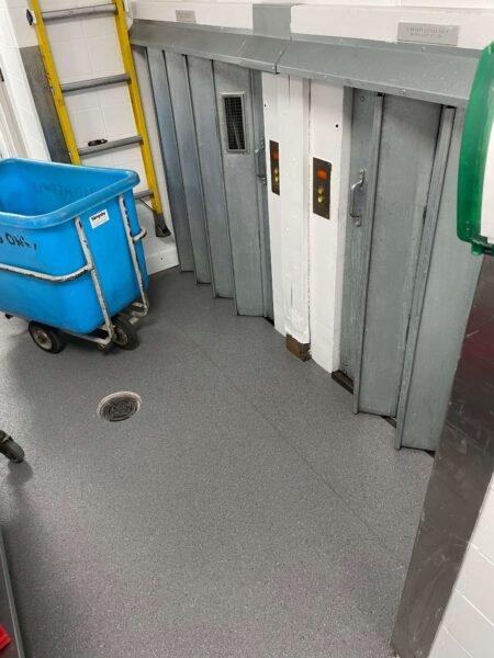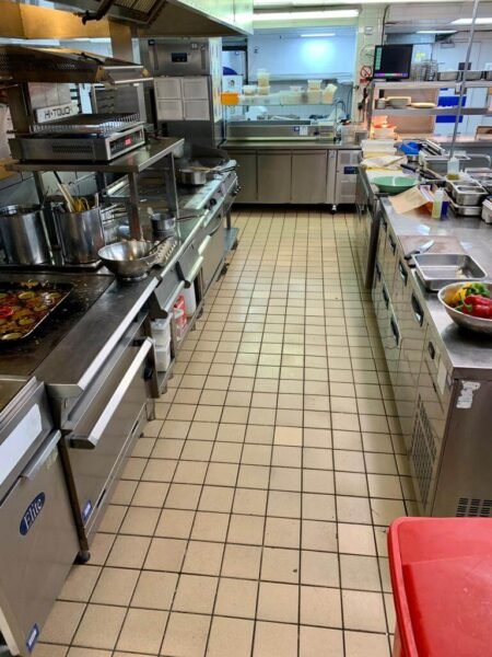 The Selby installation team transformed a central London hotel kitchen area using Polyflor Polysafe anti-slip safety flooring. The team supplied and installed specialist ceramic primer and 3mm Ardex screed to prep the area ready for the new flooring. A full seal to all areas was completed with clear mastic to result in a professional finish. To get the job done the hardworking Selby team worked over the weekend.