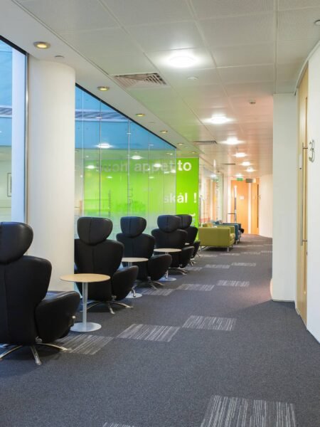 This corporate office in the heart of the City of London wanted to replace the stained old carpet tiles to a more professional look. We uplifted and recycled their old tiles. Installed 1200m2 of new tiles moving all their existing furniture and supplied and installed this Fernlea carpet tile with feature tiles. This design was done by our installers and the clients love it.