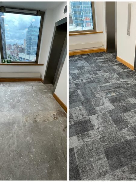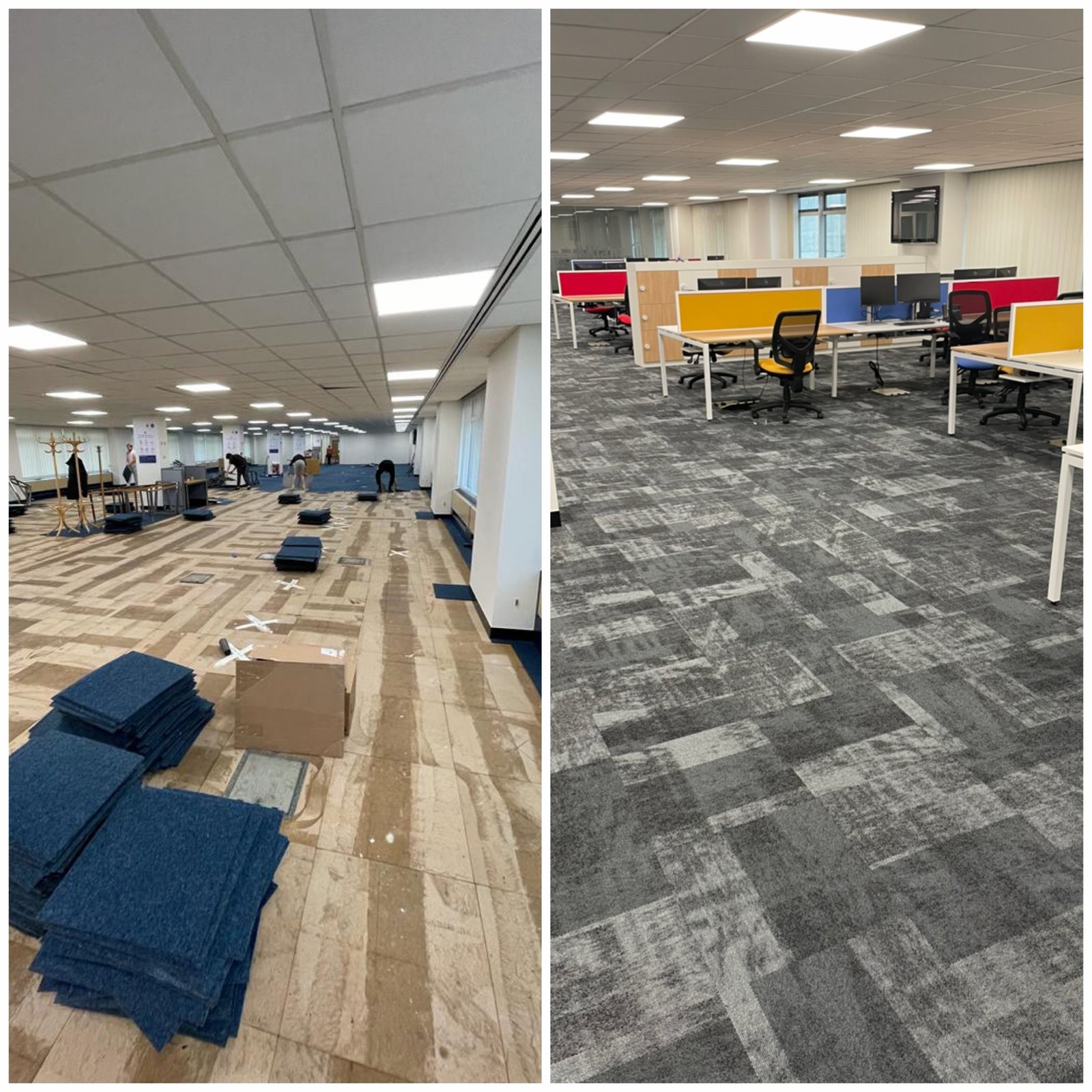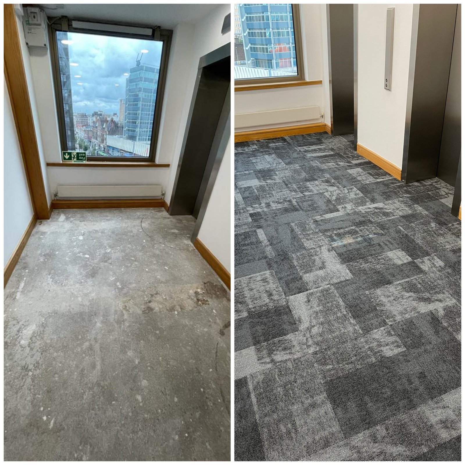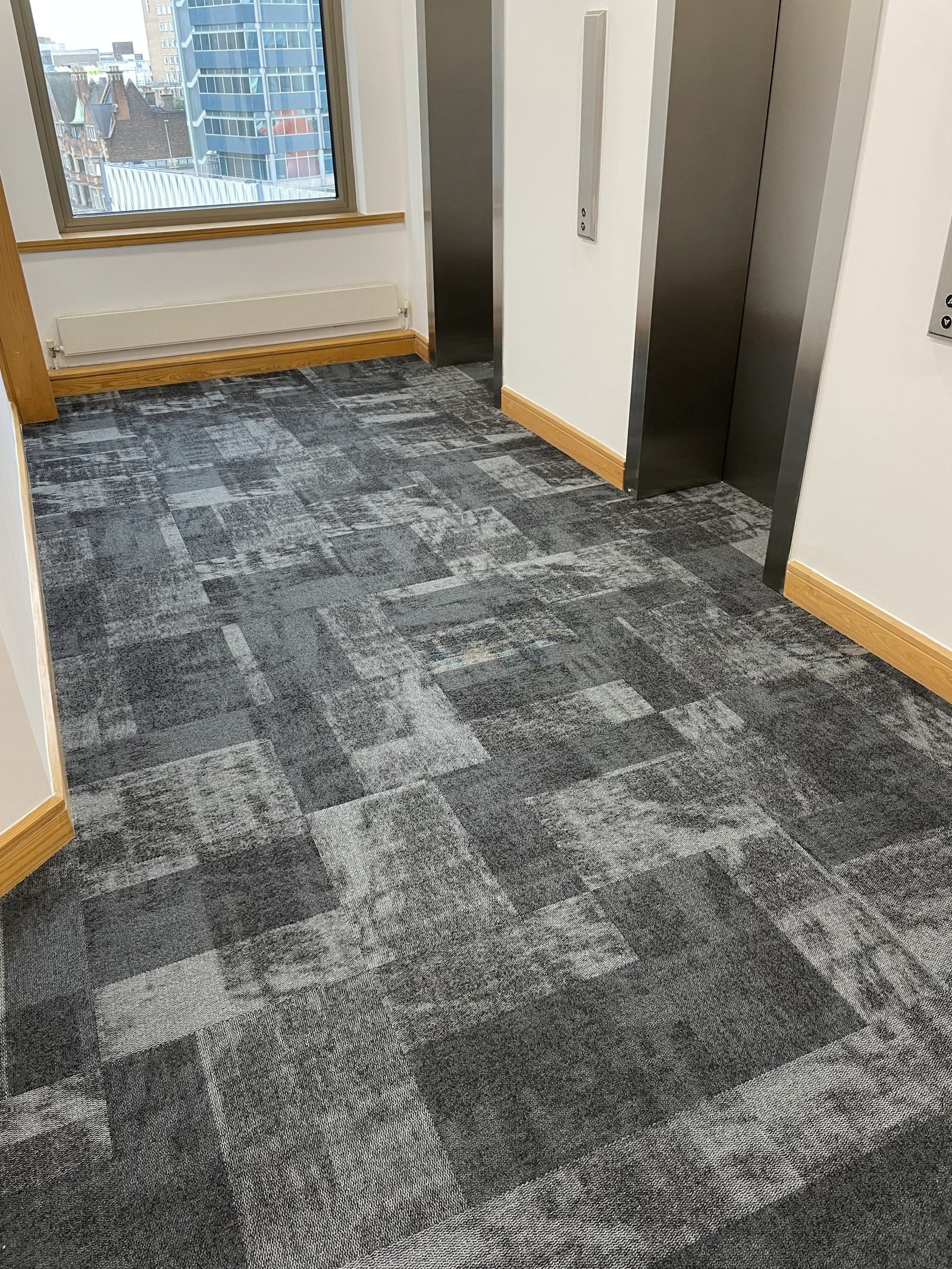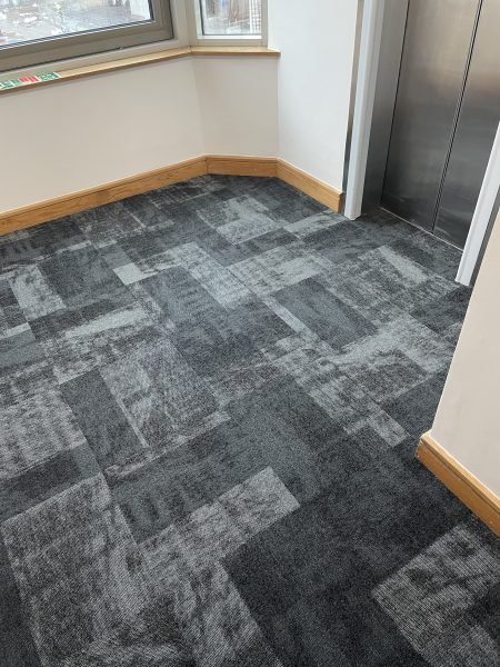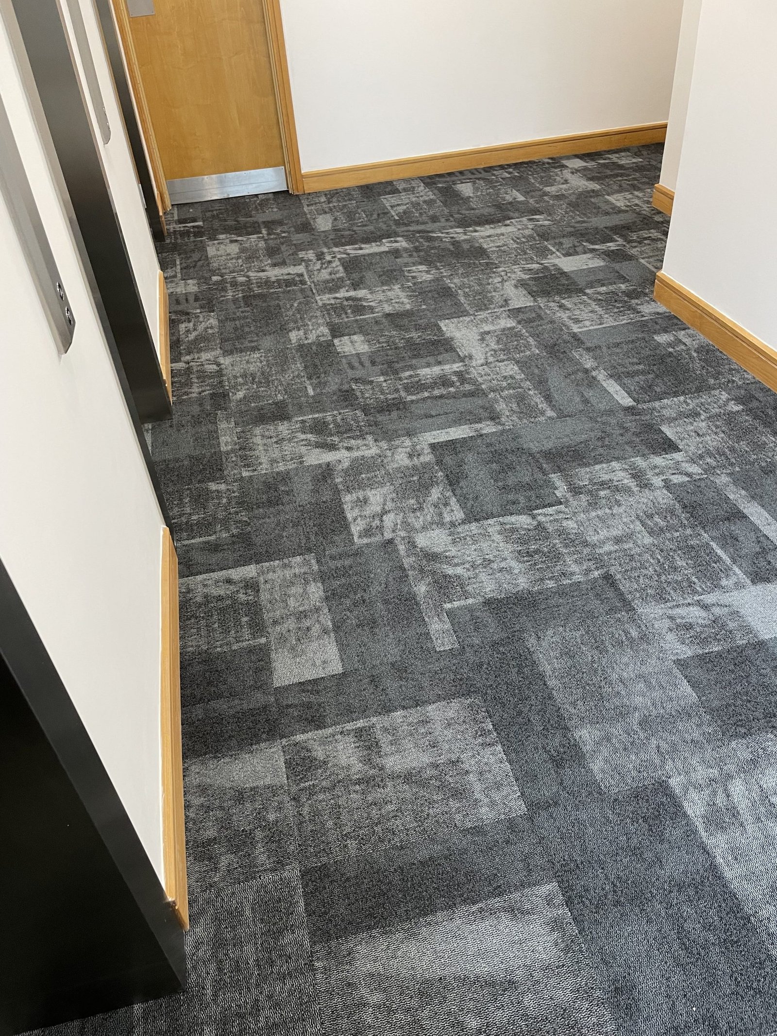 Another great transformation by the Selby installation team across several office floors including kitchen areas, lift, and toilet lobbies. The old, worn-out carpet tiles were removed and replaced with Milliken Unexpected Purpose to create a striking finish. LVT was also fitted in each kitchen area across the 4 floors along with Polyflor throughout the multiple toilet lobbies allowing for easy cleaning. Our client was delighted with the results and has booked in for our annual cleaning and maintenance service throughout the year.