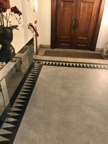 The brief was simple. Replace the flooring like-for-like for the flooring that had been down since the block was built. We used Forbo Marmoleum with all the borders being pre-cut into shapes before delivery and then re-cut on-site by our expert installation teams to make sure every triangle was the same size and met exactly with every corner block. As always with borders and design work the install was painstakingly slow but the result as you can see is perfection.
